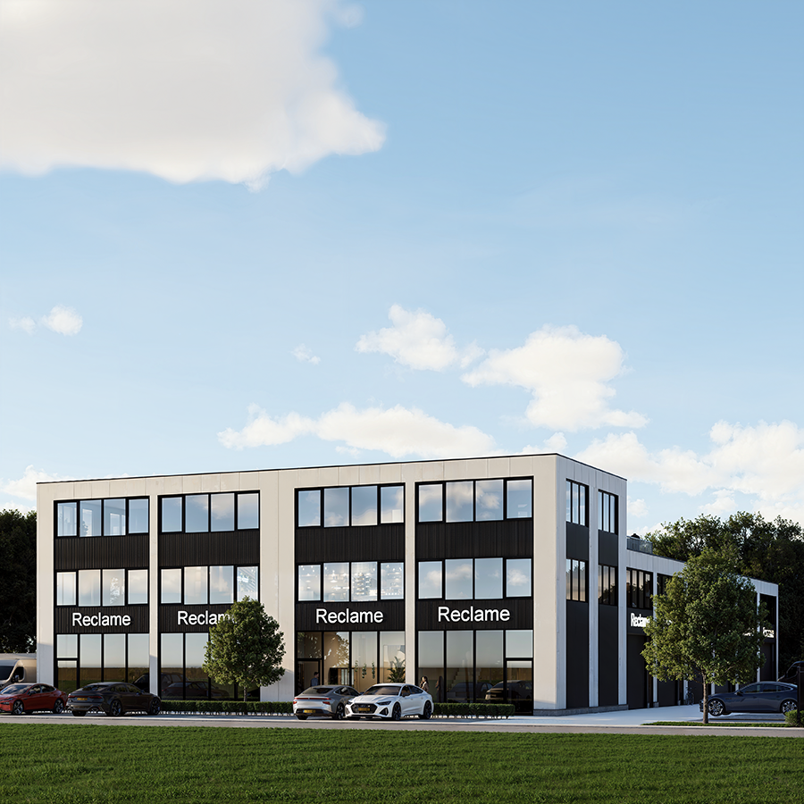 De architectuur kenmerkt zich door een strakke, moderne vormgeving met een heldere ritmiek in de gevel. Door het gebruik van lichte geveldelen in combinatie met donkere accenten ontstaat een krachtig en representatief beeld dat past binnen een zakelijke en industriële omgeving.